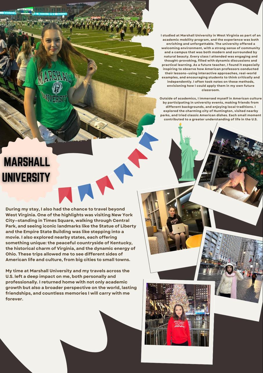 Yespanova Karlygash, a second-year master's student of the program 7M01706 “Foreign Language: Two Foreign Languages,” participated in an academic mobility program in the 2024–2025 academic year. She studied at Marshall University (USA) during the fall semester. Her coursework included academic writing, the structure of English, and interpersonal communication. The program deepened her linguistic knowledge and enhanced her critical thinking and academic perspective. Studying in an international environment provided valuable insight into modern teaching methods. This experience will support her future professional development.