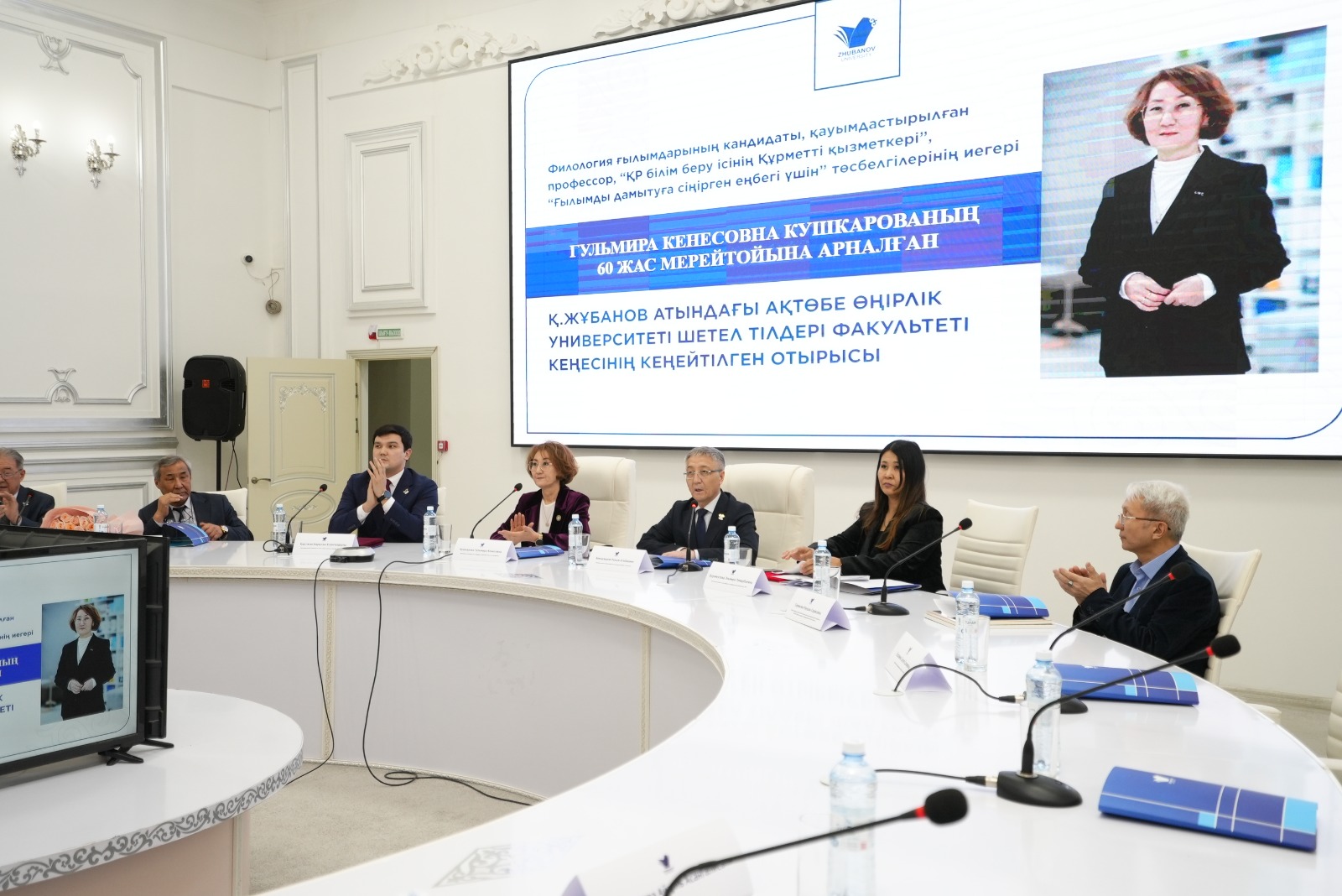 An extended meeting of the Faculty Council of the Faculty of Foreign Languages was held in honor of the 60th anniversary of Gulmira Kushkarova, a lecturer at K. Zhubanov Aktobe Regional University, Candidate of Philological Sciences, Associate Professor, and recipient of the “Honored Worker of Education of the Republic of Kazakhstan” and “For Contribution to the Development of Science” awards.