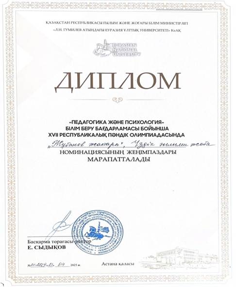 In the 2024–2025 academic year, within the framework of the 17th Republican Subject Olympiad in the “Pedagogy and Psychology” educational program, organized by L.N. Gumilyov Eurasian National University, she was awarded the nomination “Best Scientific Project.”