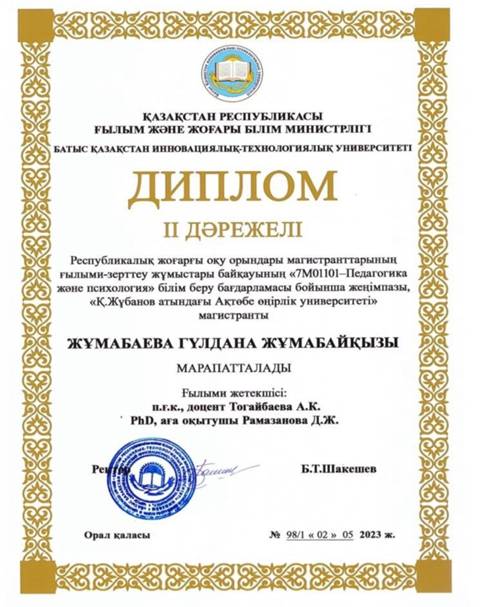 At the Republican Competition of Research Works of Master’s Students of Higher Education Institutions, master’s student Zhumabayeva Guldana Zhumabaykyzy, enrolled in the educational program “7M01101 – Pedagogy and Psychology,” was awarded a Diploma of the II Degree.