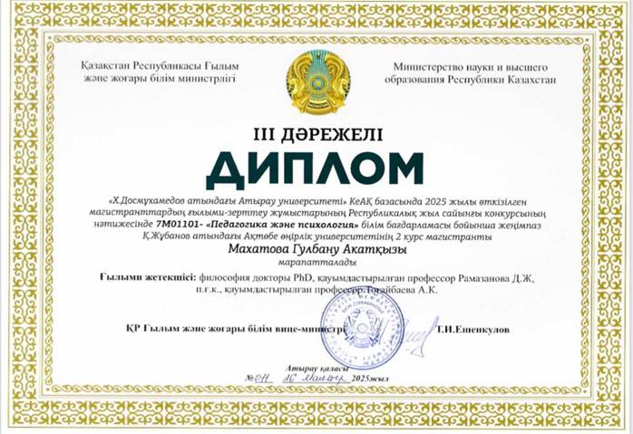 Based on the results of the Republican Annual Competition of Research Works of Master’s Students, held in 2025 at the NAO “Atyrau University named after Khalel Dosmukhamedov,” master’s student Makhatova Gulbanu Akatkyzy, enrolled in the educational program “7M01101 — Pedagogy and Psychology,” was awarded a Diploma of the III Degree.