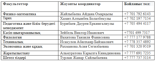 Факультеттер бойынша жауапты координаторлар тізімі.