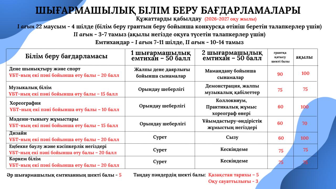 Шығармашылық емтихандардың кестесі