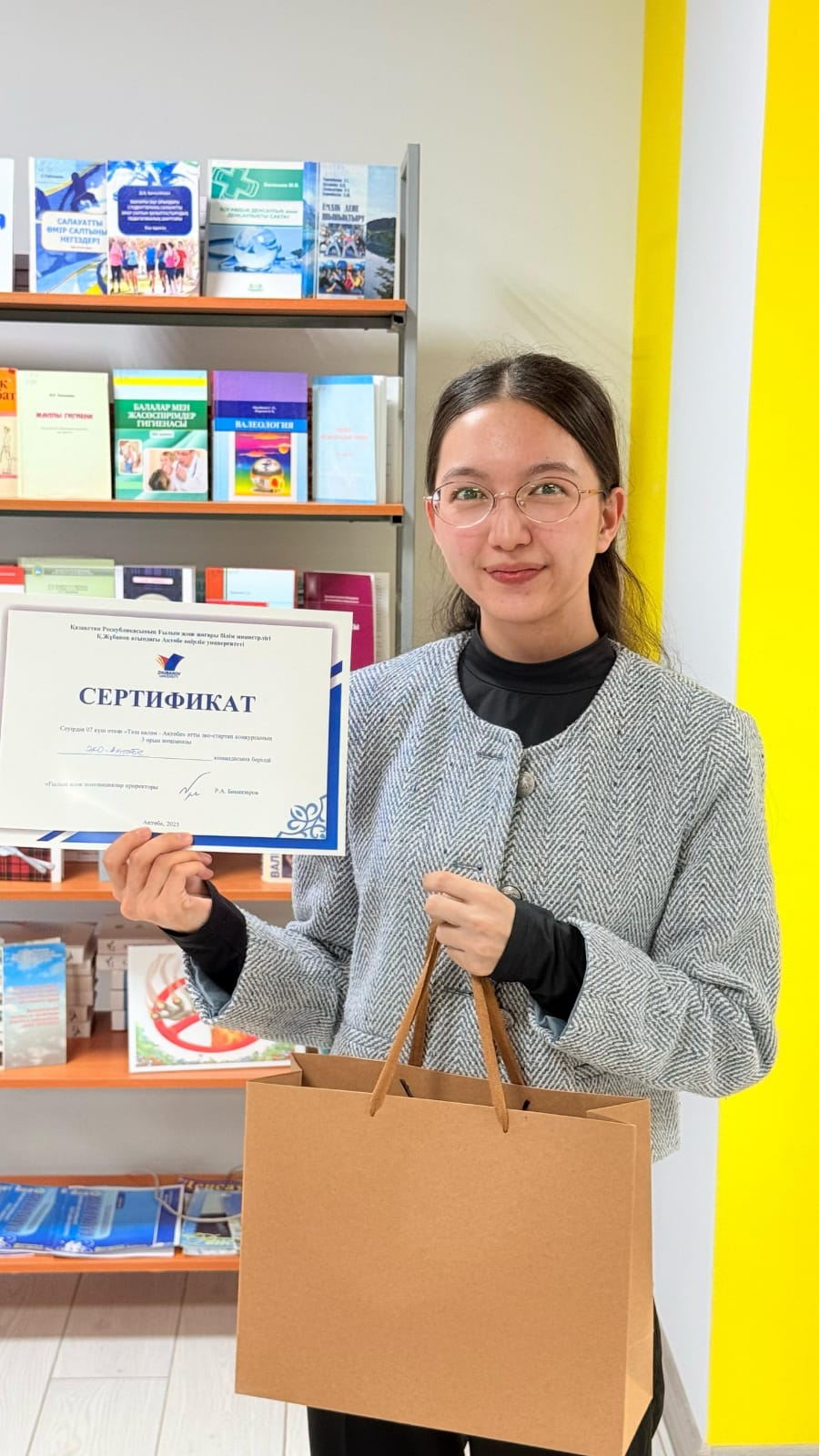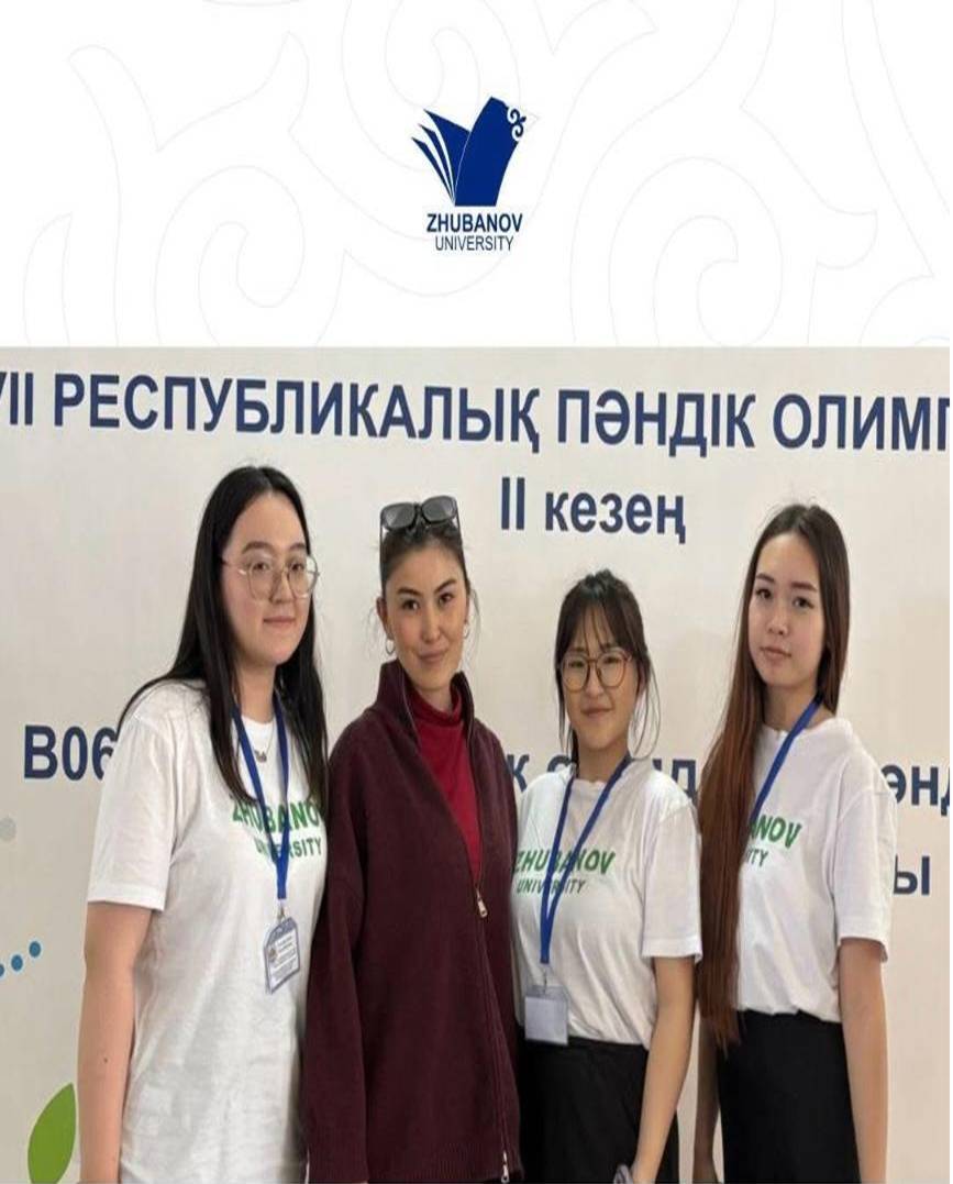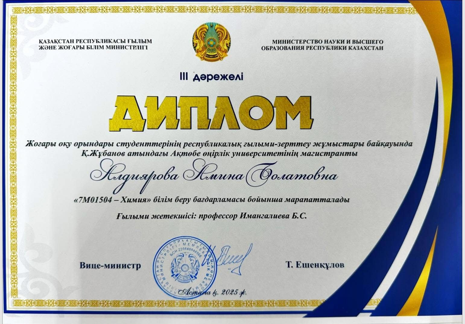 Қ.Жұбанов атындағы Ақтөбе өңірлік университеті жаратылыстану факультеті 7М01504-«Химия» білім бағдарламасының түлегі Алдиярова Амина Болатовна жоғары оқу орындары студенттері мен магистранттарының республикалық ғылыми-зерттеу жұмыстары байқауында ІІІ орын иеленді.