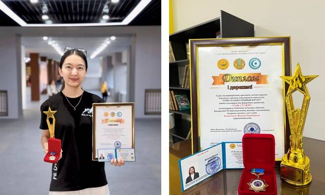 "Үздік студент" I дәрежелі дипломы және төсбелгісі — Ж.Б. Кенжебаева, 6В05302-Химия білім беру бағдарламасы. Жетекшісі: Е.Б. Досмурзина, 2024 жыл.