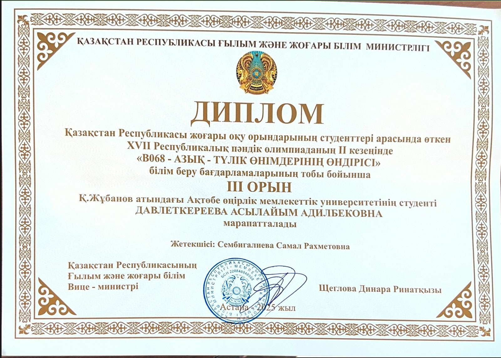 К.Кулажанов атындағы Қазақ технология және бизнес университетінде өткен Республикалық студенттік пәндік олимпиадада “6В07206 – Азық-түлік өнімдерінің технологиясы” білім беру бағдарламасы бойынша Дәулеткереева Асылайым жекелей есепте құрметті 3-орынға ие болды.
