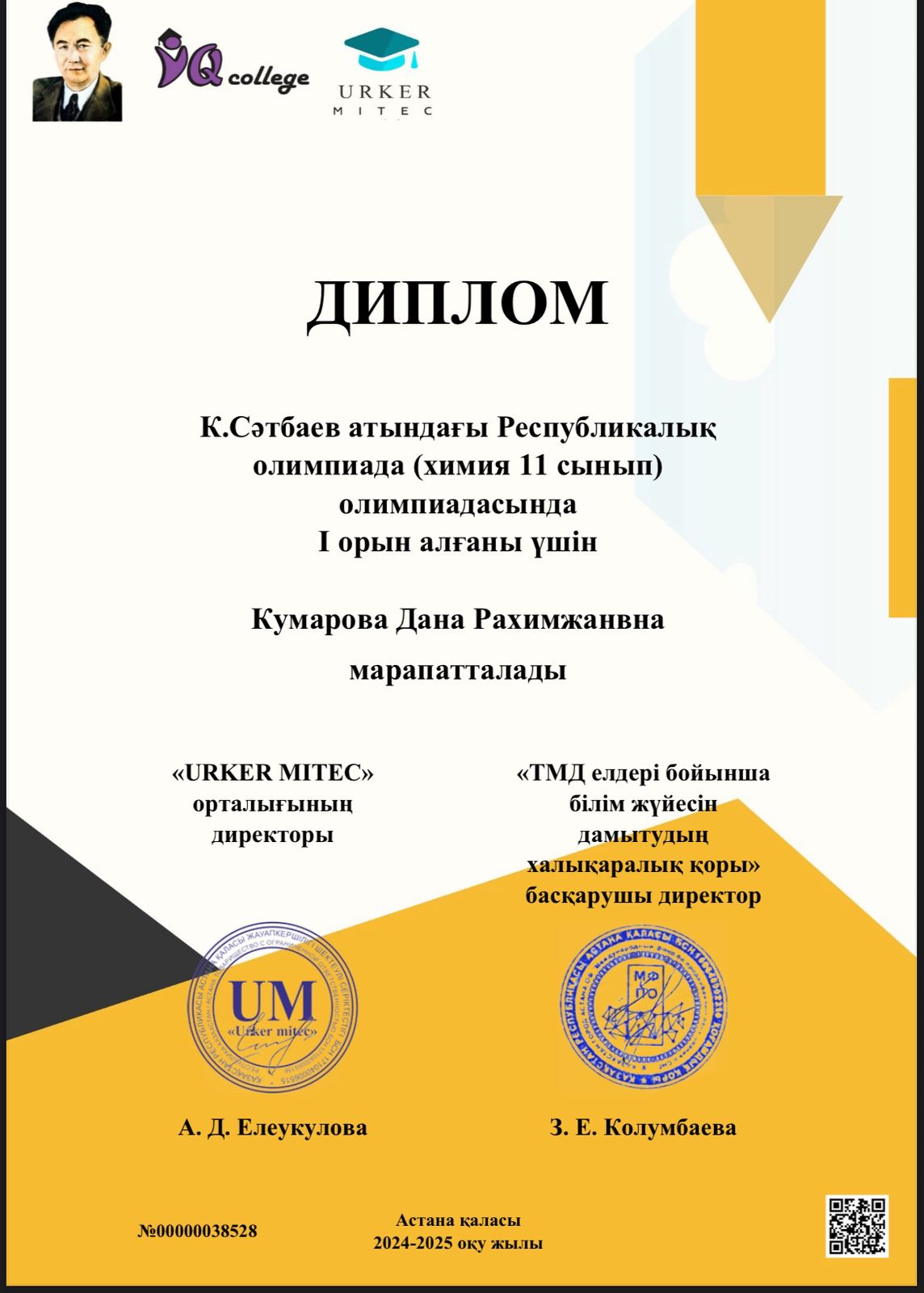 К.Сәтбаев атындағы Республикалық олимпиадасында Химиядан 1 орын (2025ж)