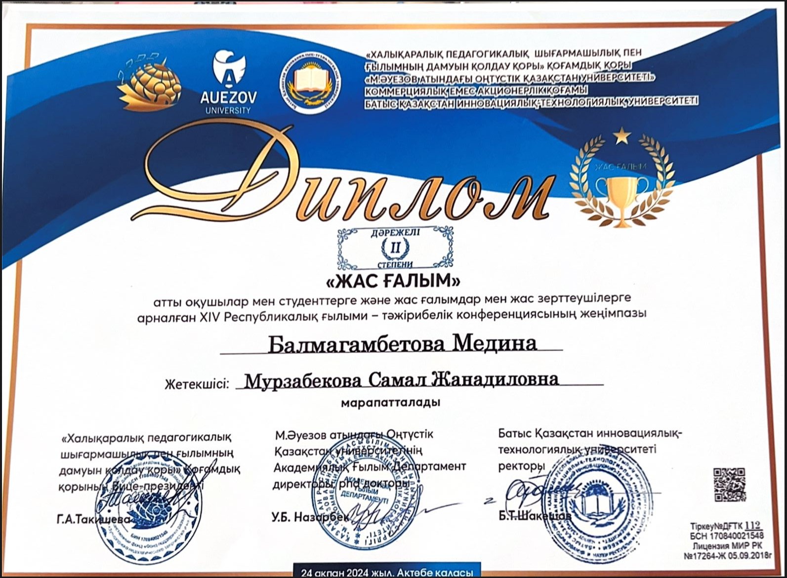 Диплом (II) СТЕПЕНИ « Ж А С Ғ А Л Ы М » атты оқушылар мен студенттерге жене ж а с ғалымдар мен ж а с зерттеушілерге арналған XIV Республикалық ғылыми - тәжірибелік конференциясының жеңімпазы