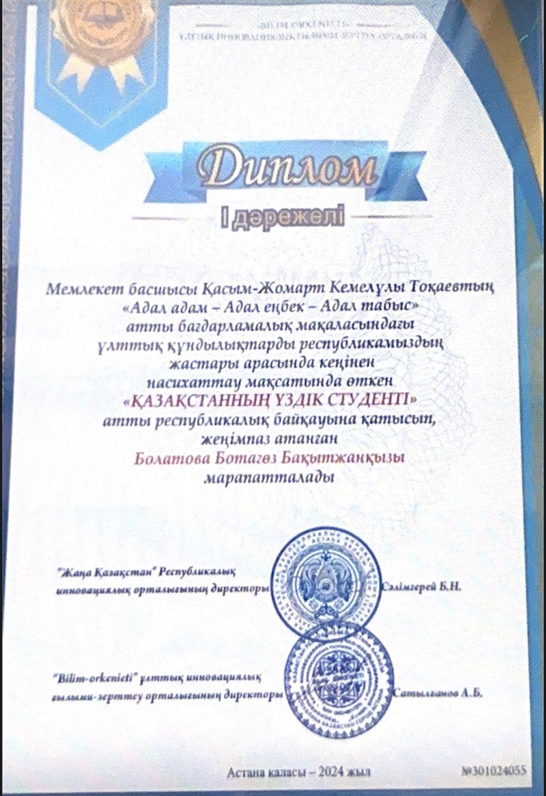 «ҚАЗАҚСТАННЫҢ ҮЗДІК СТУДЕНТІ» атты республикалық байқауына қатысып, I дәрежелі жеңімпаз атанған