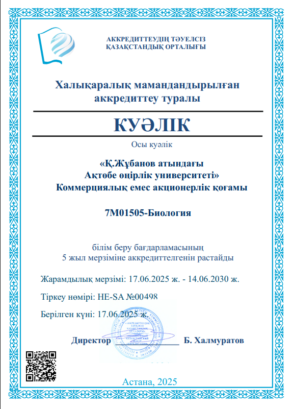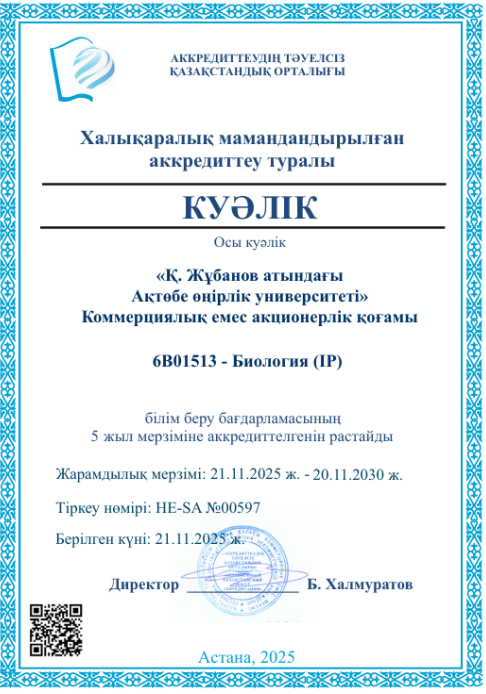 6В01513- Биология (IP) білім бағдарламасы Аккредиттеудің тәуелсіз Қазақстандық орталығы тарапынан 5 жыл мерзімге (21.11.2025 – 20.11.2030) аккредиттелді.