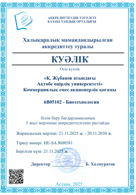 6В05102-Битехнология білім бағдарламасы Аккредиттеудің тәуелсіз Қазақстандық орталығы тарапынан 5 жыл мерзімге (21.11.2025 – 20.11.2030) аккредиттелді.
