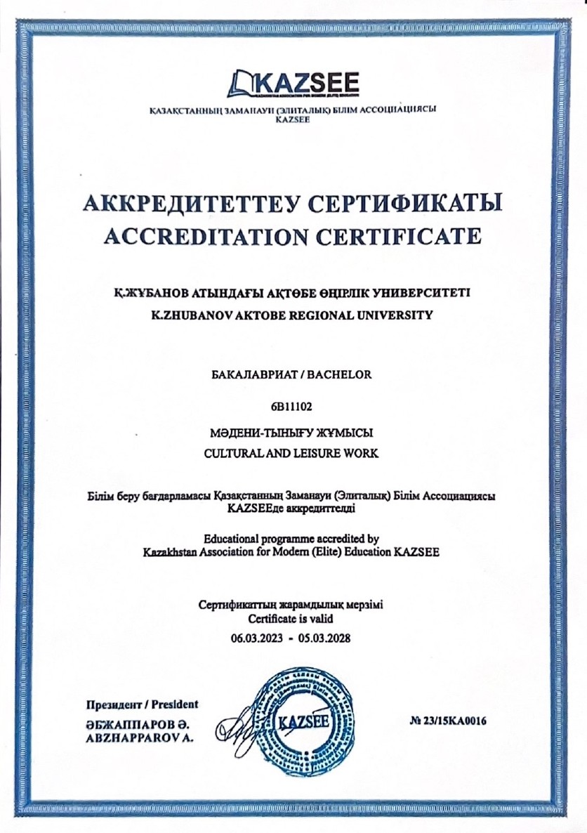 6В11102 – «Мәдени – тынығу жұмысы» ББ «Қазақстанның Заманауи (Элиталық) Білім Ассоциасы KAZSEE» аккредитациясынан 5 жыл мерзімге аккредитациядан өту сертификатын алды (06.03.2023ж. – 05.03.2028ж.) .