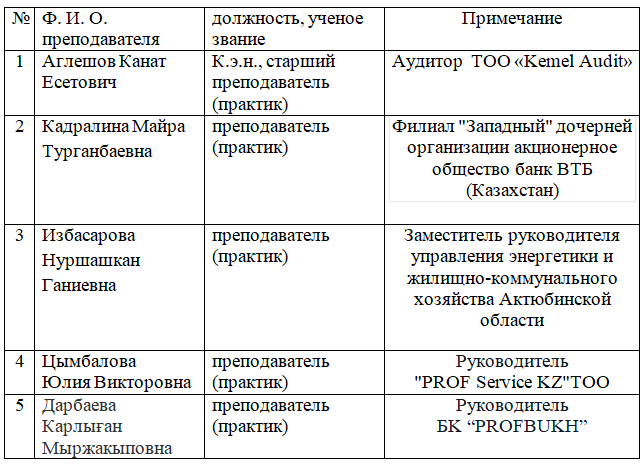по ОП 6В04103 «Учет и аудит» АО «СНПС-Актобемунайгаз», Департамент государственных доходов по Актюбинской области Комитета государственных доходов Министерства финансов Республики Казахстан, АО ТНК «Казхром», АФ АО «Каѕріbank", АФ АО "Народный Банк Казахстана", ТОО "Южпромснаб", ТОО "БатысЖер«, АО"Группа компаний ТОО» НБ-Транс«, СП» ProfBukh«, ТОО» СП-Баланс«,» PROF Service " (бухгалтерские и аудиторские услуги) и др.;