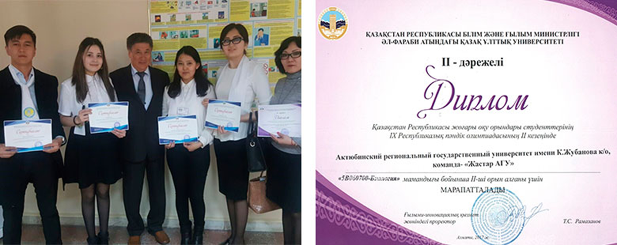 В 2024–2025 учебном году в г. Алматы на базе Казахского национального педагогического университета имени Абая состоялась XVII Республиканская предметная олимпиада по биологии среди студентов вузов РК. Обучающиеся образовательной программы 6В01505 – «Биология» студентка 4 курса Еденова А.М. и студент 3 курса Қалдығұлов А.Қ. приняли участие и заняли 3-е призовое место в командном зачёте.