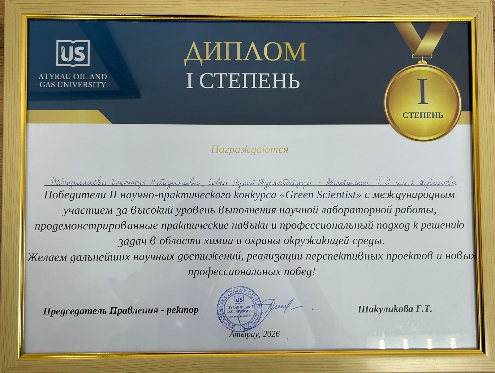 «Green Scientist» II научно-практический конкурс, ОП «6В05302 — Химия»,I место . Н. Совет, Б. Набидоллаева.Руководитель: М. К. Мырзағалиев, 2026 год.