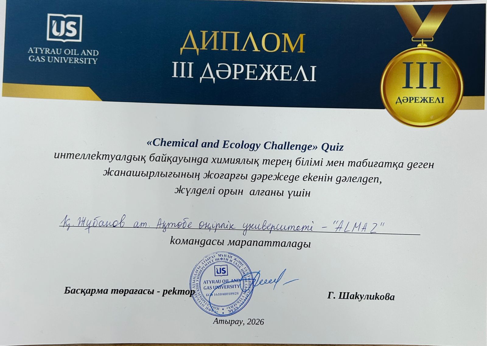 Конкурс «Safi Quizz», ОП «6В05302 — Химия», III место — Д. Даулетбаев, Г. Унгарбаева.Руководитель: М. К. Мырзағалиев, 2026 год.