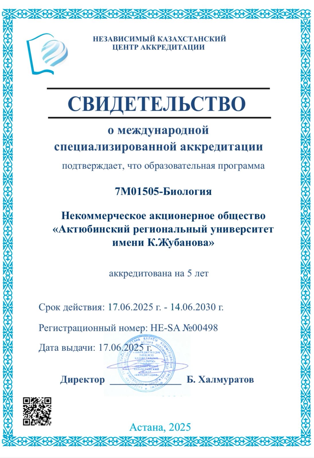ОП 7М01505-«Биология» аккредитована экспертной комиссией «Независимого казахстанского центра аккредитации (НКЦА)» на 5 лет ( 17.06.2025 г. по 14.06.2030 г.).