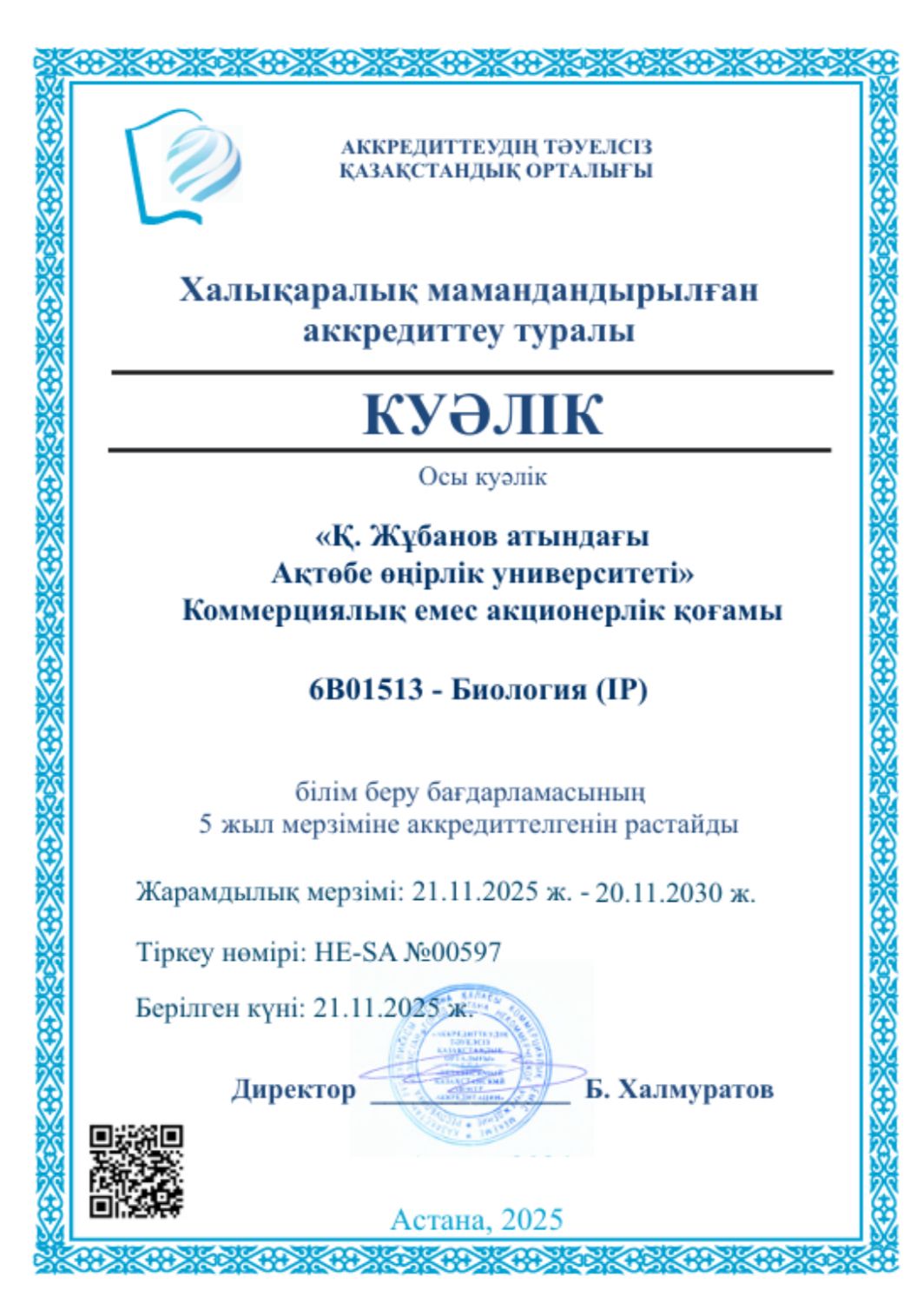 6В01513 – «Биология ІР» аккредитована экспертной комиссией «Независимого казахстанского центра аккредитации (НКЦА)» на 5 лет ( 21.11.2025 г. по 20.11.2030 г.).