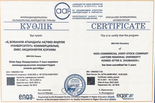 ОП 6В01504 – «Химия» по итогам проверки экспертной комиссией Некоммерческое учреждение «Независимое агентство аккредитации и рейтинга» получило сертификат специализированной аккредитации сроком на 5 лет (05.12.2021 г.-04.12.2026 г.)
