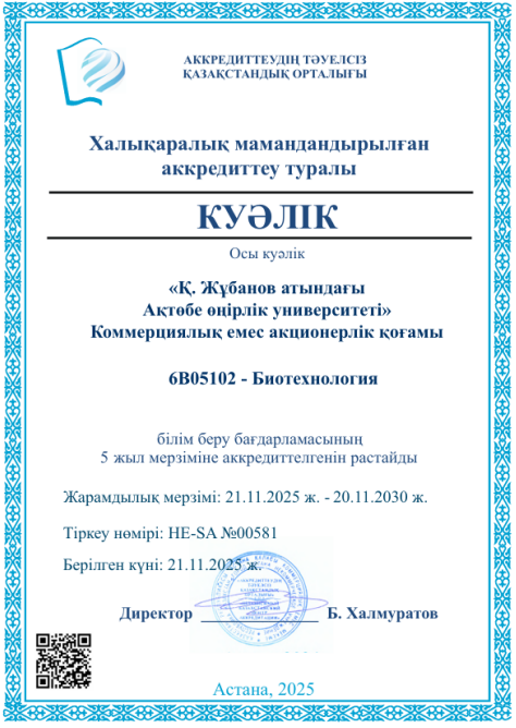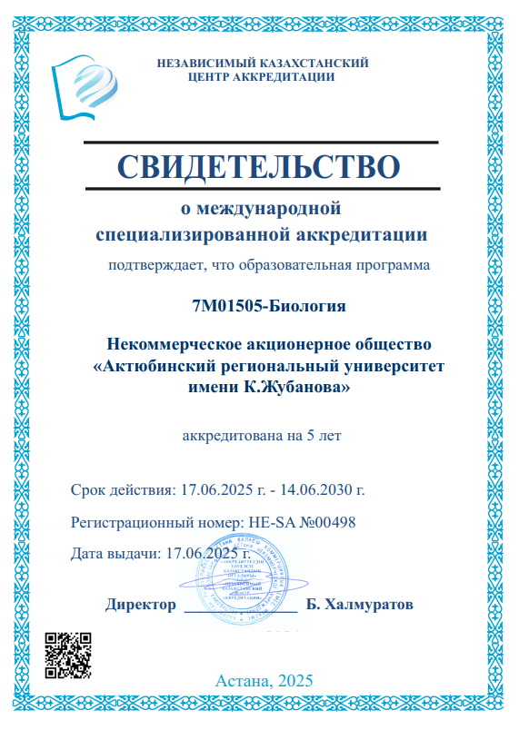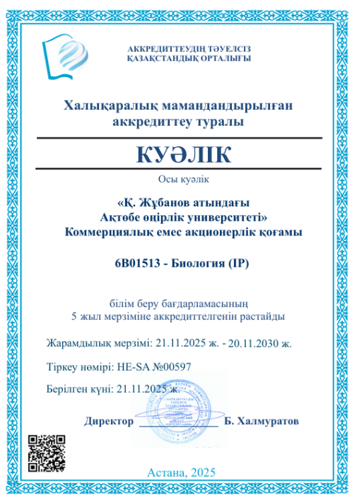 Образовательная программа 6В01513 – Биология (IP) аккредитована Независимым Казахстанским центром аккредитации сроком на 5 лет (21.11.2025 – 20.11.2030).
