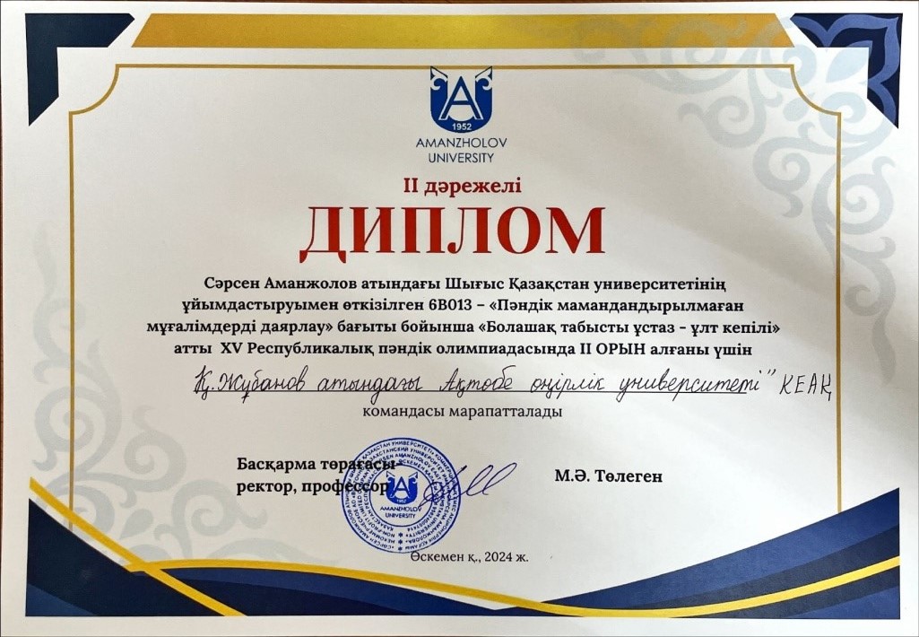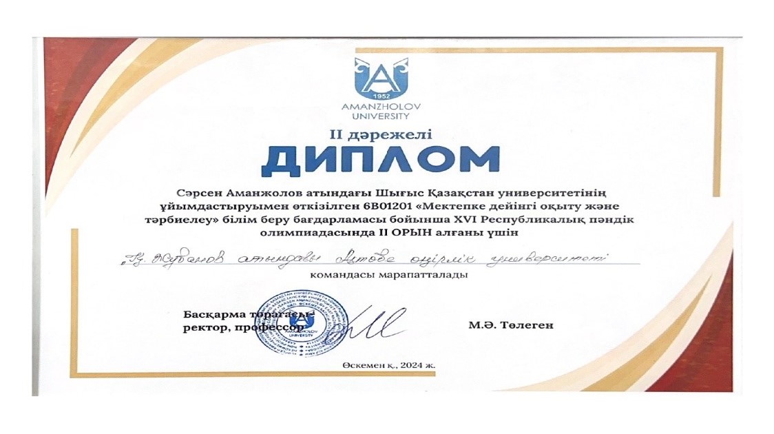 2024–2025 учебном году на XVI Республиканской предметной олимпиаде по образовательной программе 6В01201 «Дошкольное обучение и воспитание», организованной Восточно-Казахстанским университетом имени Сарсена Аманжолова, занял(а) 2-е место.