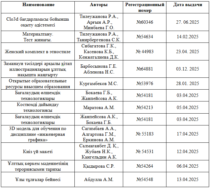 Со стороны университета были проведены бесплатные курсы английского языка, по результатам которых с ноября по май месяц 2023-2024 учебного года 10 преподавателей кафедры получили сертификат. Из них Касенова К.Б. и Танирбергенова С.К преподают на образовательной программе 7M01405 — Визуальное искусство, художественный труд, графика и проектирование.